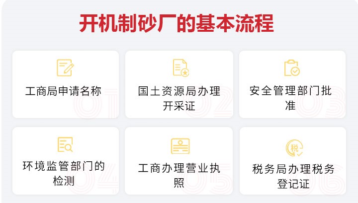 工商局申請(qǐng)名稱(chēng)→國(guó)土資源局辦理開(kāi)采證→安全管理部門(mén)批準(zhǔn)→環(huán)境監(jiān)管部門(mén)的檢測(cè)→工商辦理營(yíng)業(yè)執(zhí)照→稅務(wù)局辦理稅務(wù)登記證。